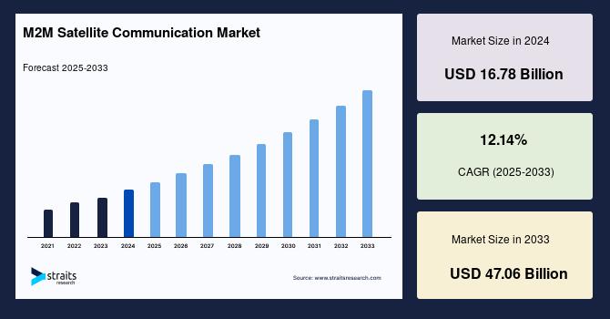 According to StraitsResearch, the global m2m satellite communication market size is valued at USD 16.78 billion in 2024 and is estimated to reach USD 47.06 billion by 2033, growing at a CAGR of 12.14% during 2025-2033.